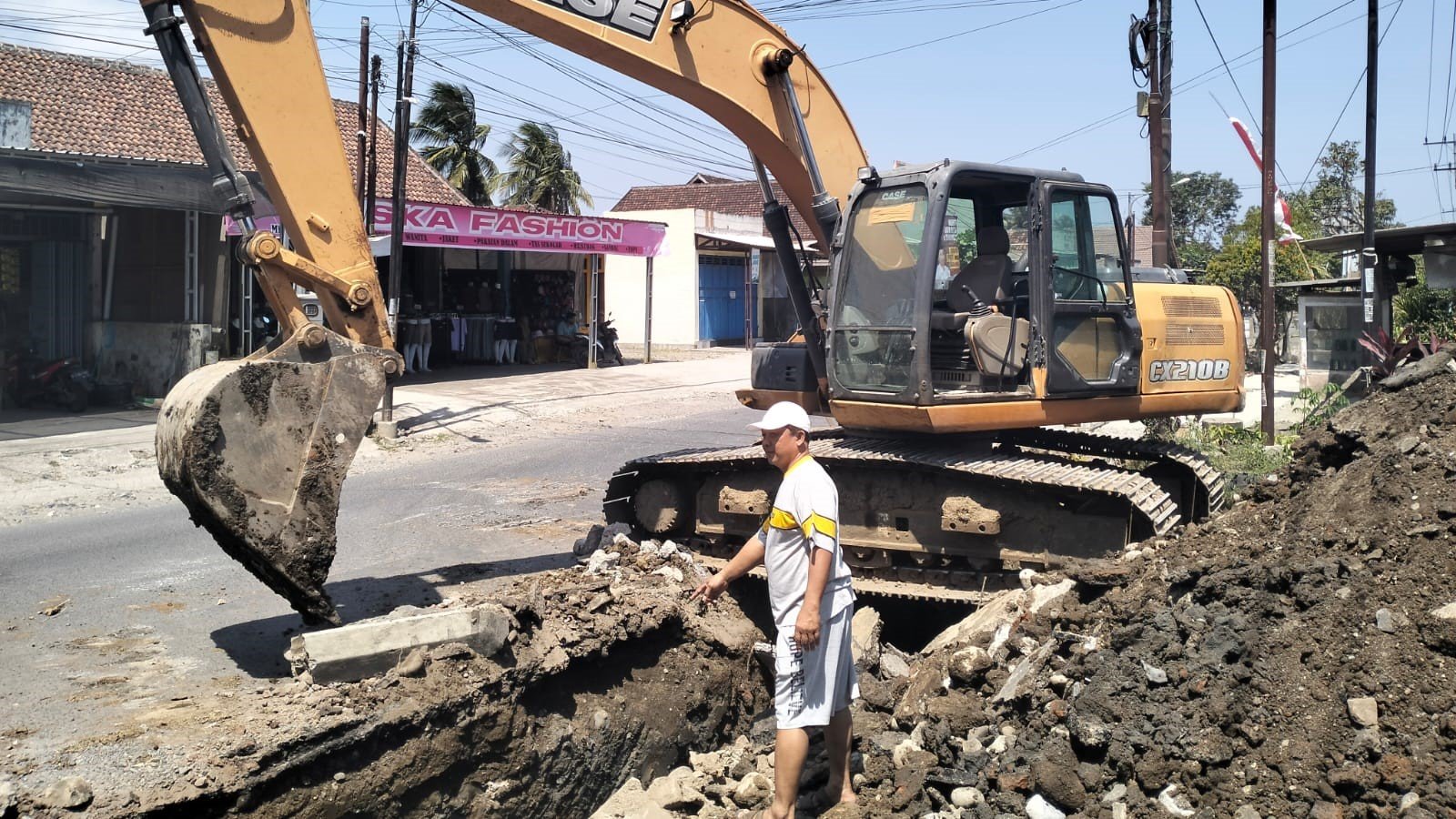 Sedulur, Pesanggaran - Sebuah unit excavator terlihat beraktivitas memperbaiki saluran irigasi atau drainase di jalan utama Desa Sumberagung, Kecamatan Pesanggaran, Kabupaten Banyuwangi, tepatnya di simpang tiga Loh Hwee, Kamis, 28 September 2023.