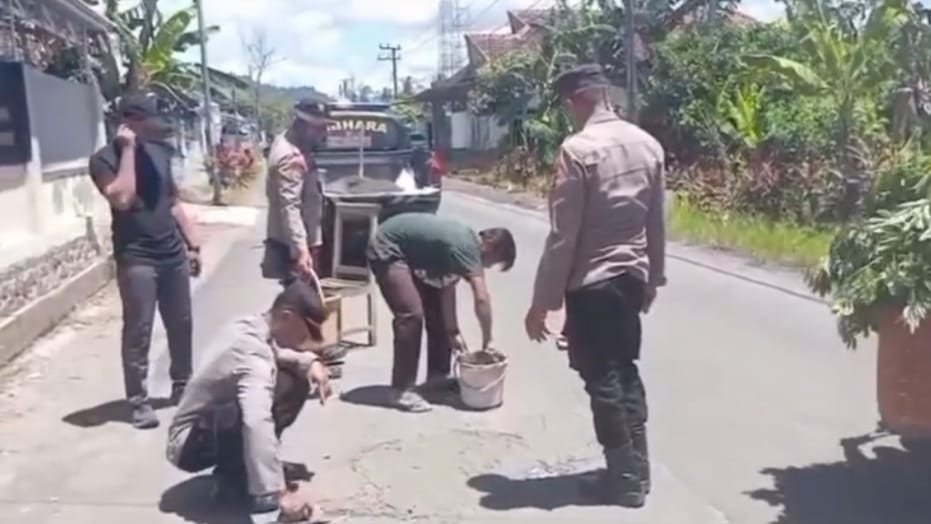 Anggota Polsek Pesanggaran Tambal Jalan di Sumberagung Bersama Warga